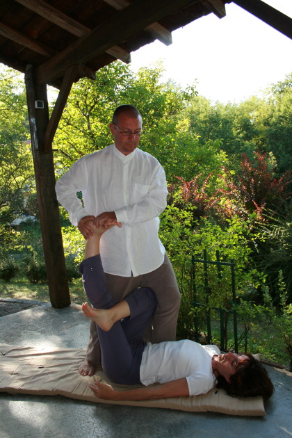 des étirements réalisés avec toutes les parties du corps du masseur: mains, coudes, bras,